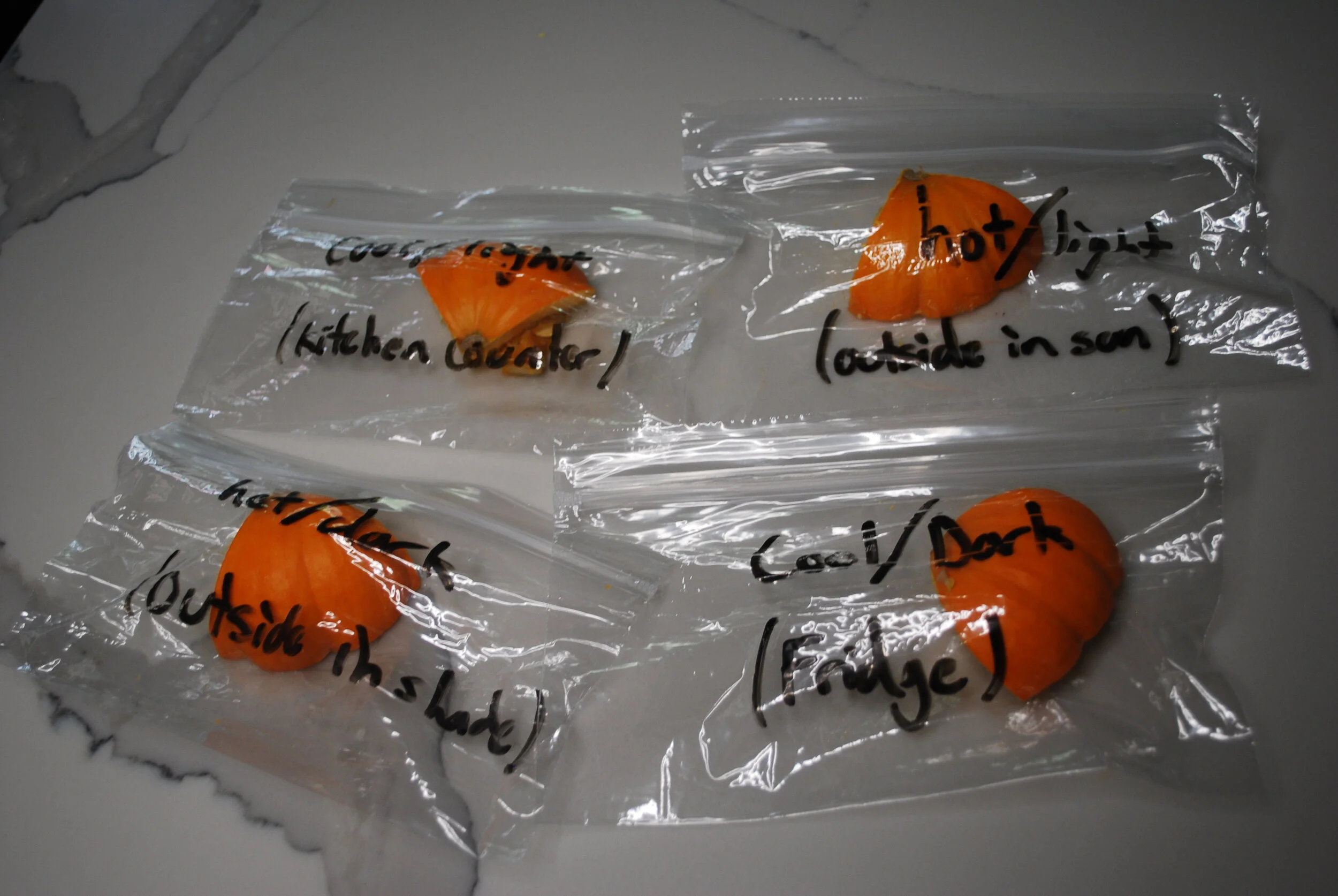 Label the bags to represent each of your conditions. Then, put a piece of pumpkin in each bag. Close the ziploc bags most of the way to ensure that air can still enter.